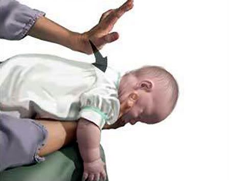 - Cách thứ nhất: người sơ cứu ngồi, đặt trẻ nằm vắt ngang qua đùi người sơ cứu ở tư thế mặt ngước lên, đầu thấp hơn ngực. (để đường thở thành đường thẳng tạo điều kiện tốt cho dị vật dễ ra ngoài). Vỗ vào lưng 5 lần ở vị trí giữa hai xương bả vai của trẻ, theo hướng từ dưới lên – mạnh nhé. Như là bạn đang muốn đẩn nó ra ngoài.